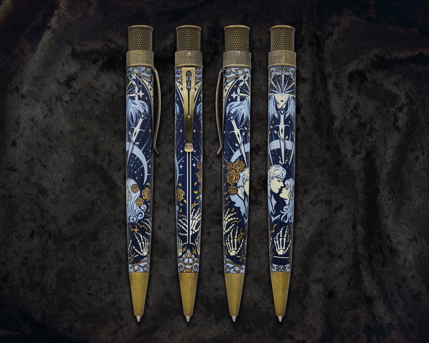 This Pen Boutique exclusive captures the tragic romance between two souls whose love was so deep that it was envied by the heavens. The Lovers are depicted at the center of the barrel, locked in a timeless gaze. The design is richly printed in full color against antique brass accents, with delicate details like the roses bleeding through the metalwork—merging elegance with an eerie mystique. The finial is topped with the Roman numeral "VI," representing the Lovers card in traditional tarot decks.